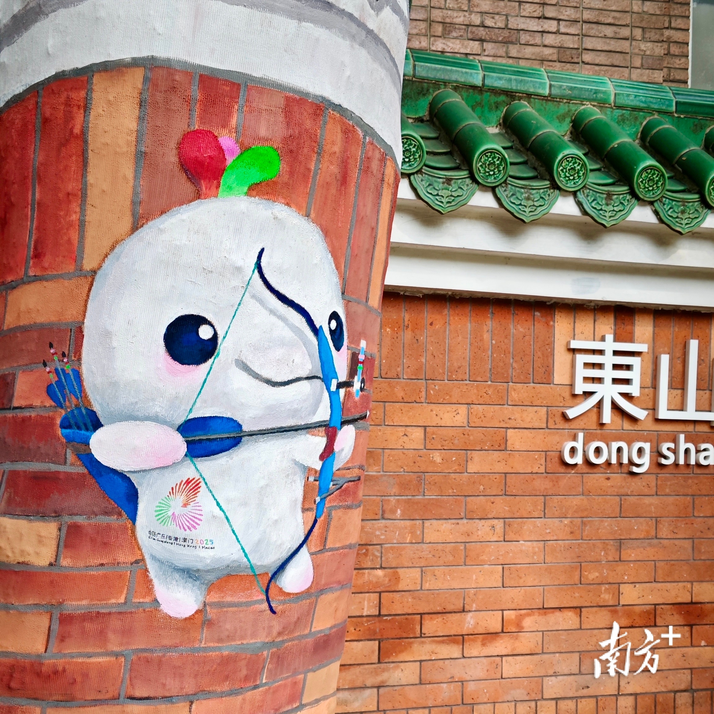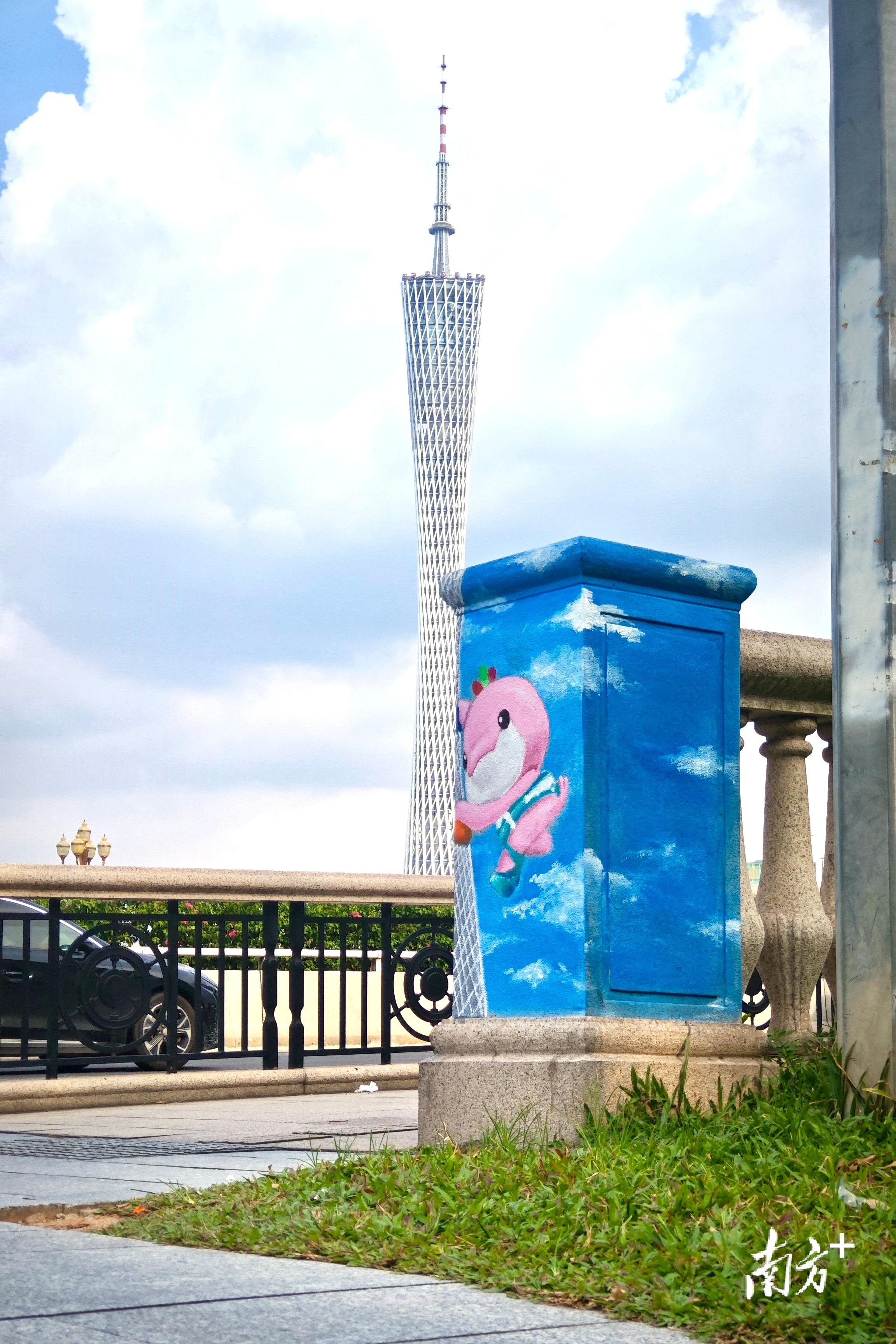 广州大桥桥墩美化,手绘的吉祥物与远处的广州塔相互辉映。