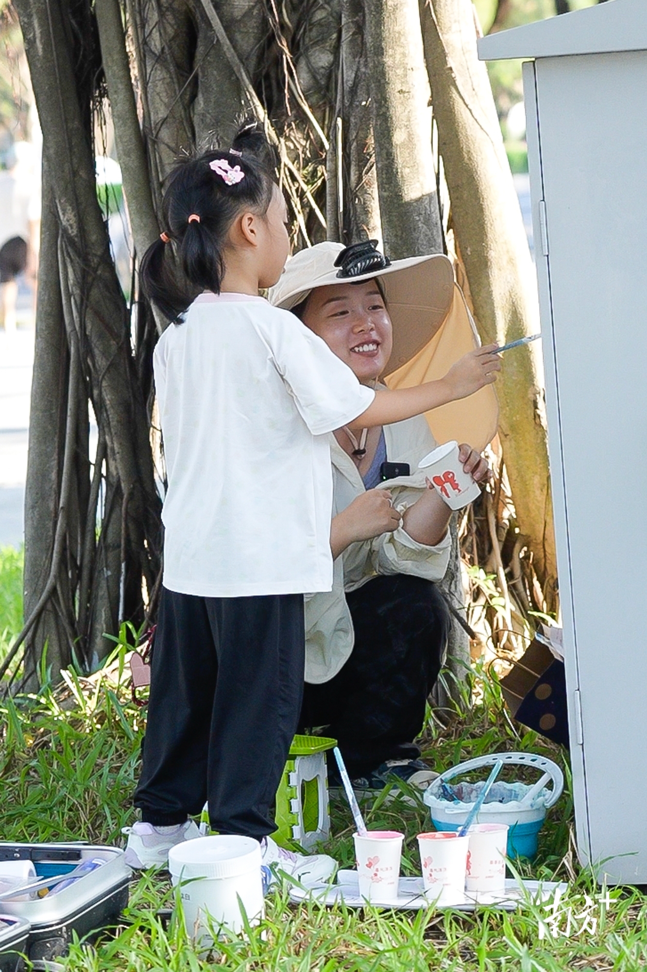 路过的小朋友被手绘吸引驻足欣赏,孙孙邀请她共创。